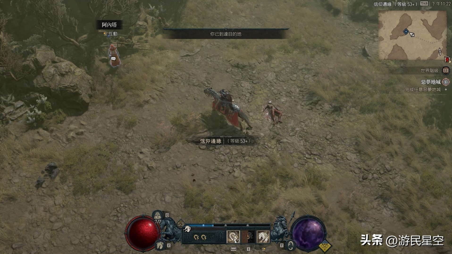 这并不代表游戏的全部战斗和事件都会发生在这片广阔的地图之中,暗黑系列最标志性的地下城玩法自然不会缺席,数百个随机生成的支线地下城随时可供玩家探索,旅行的过程中,玩家时常会被路边一个发光的圣坛吸引,刷完一波怪又被两个蓝色感叹号引到了另一个据点。