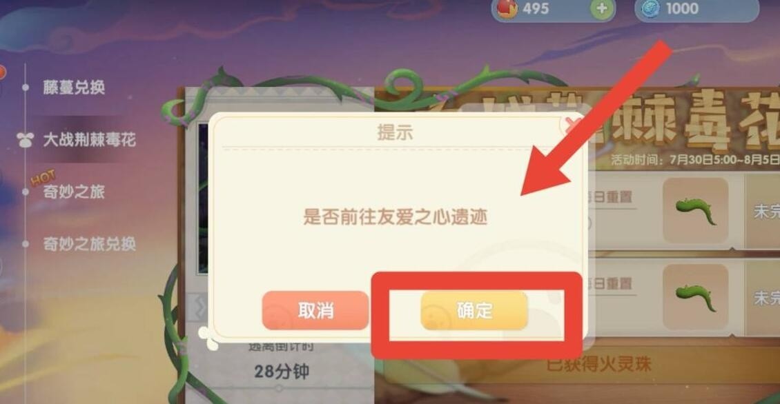 点击右下角的“前往”,进入友爱之心遗迹,这是召唤火精灵的关键地点。