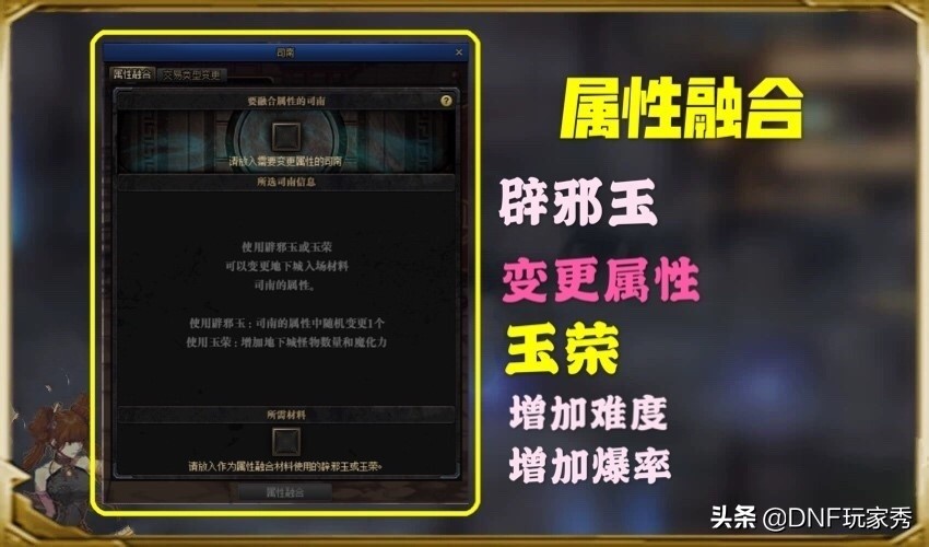 - 属性融合:玩家可以使用辟邪玉和司南进行合成,随机变更一个司南的属性,用玉荣和司南合成,可以增加副本怪物数量,提升魔化力,即增加副本难度,随着难度的增加,怪物爆出辟邪玉、玉荣、司南碎片的几率也会相应增加。