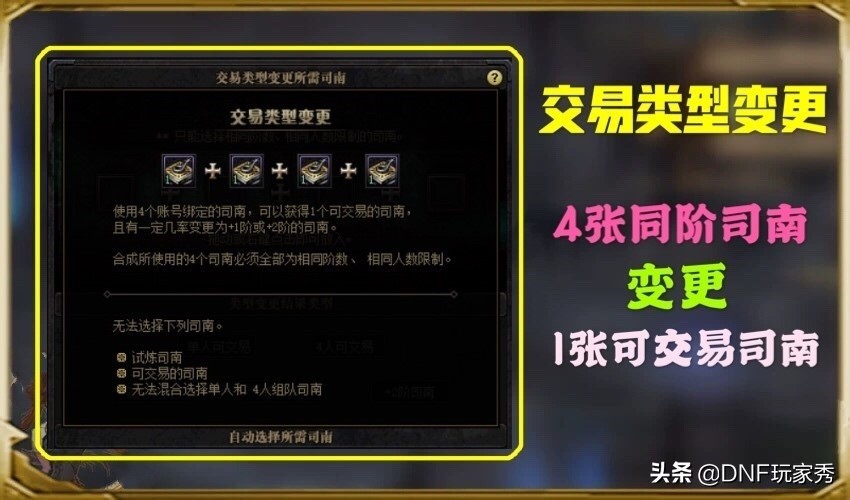 - 交易类型变更:玩家可以将四张账号绑定的司南合成为一张可交易的司南,且有可能提升司南等级至1-2阶!但合成的胚子司南必须是四张相同等级司南,且单人和组队司南不能混合变更,这一功能的出现,使得玩家的低阶司南有了用处,不再因为节约疲劳而直接丢弃。