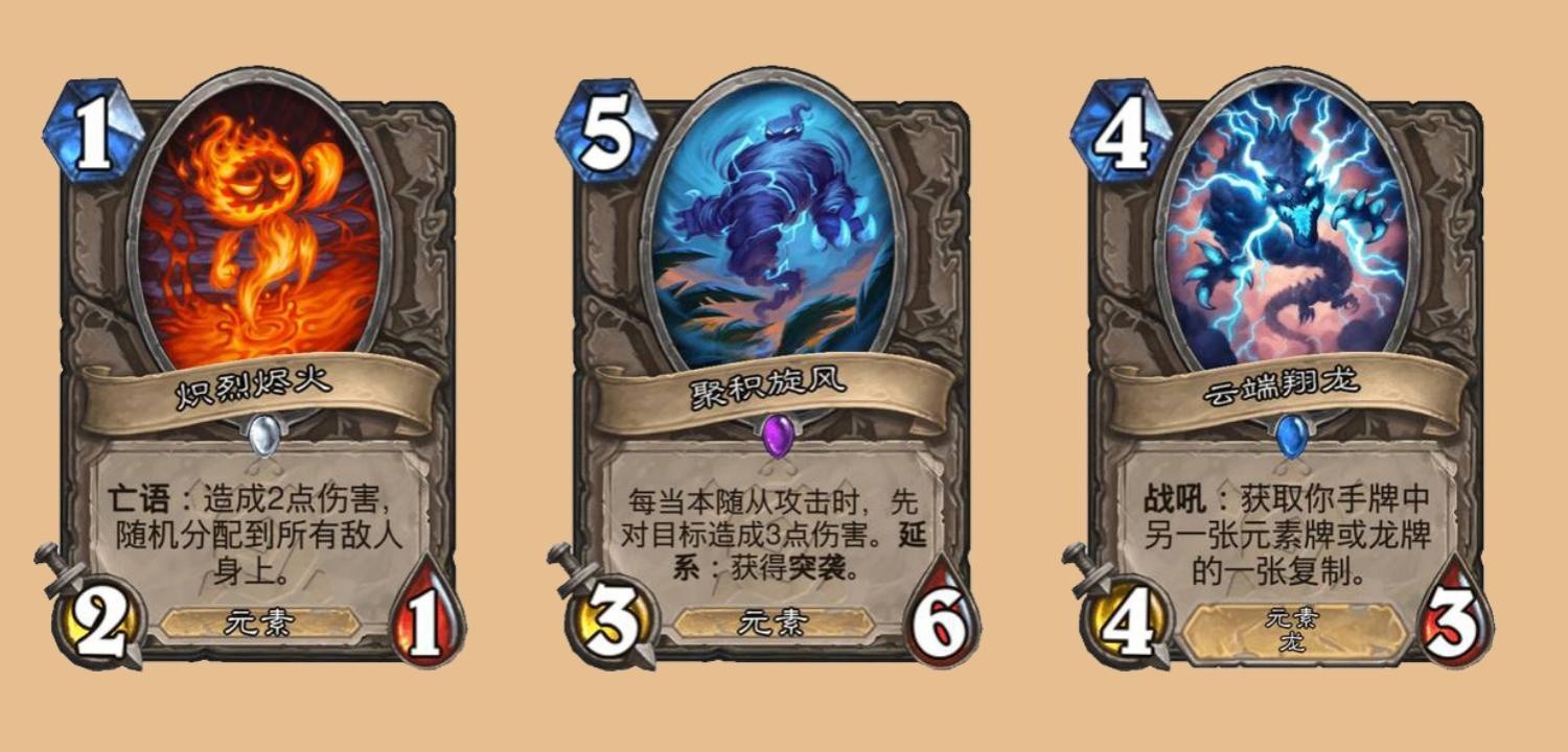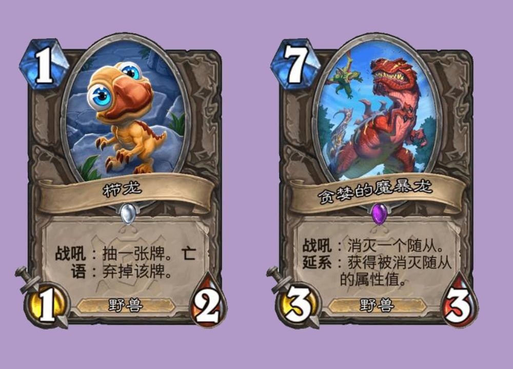 栉龙与贪婪的魔暴龙: 栉龙看起来是为快攻设计的一张卡,1费1/2,战吼抽牌,亡语弃牌,而贪婪的魔暴龙战吼消灭一个随从,延系获得被消灭随从的属性值,其使用场景也值得探讨。