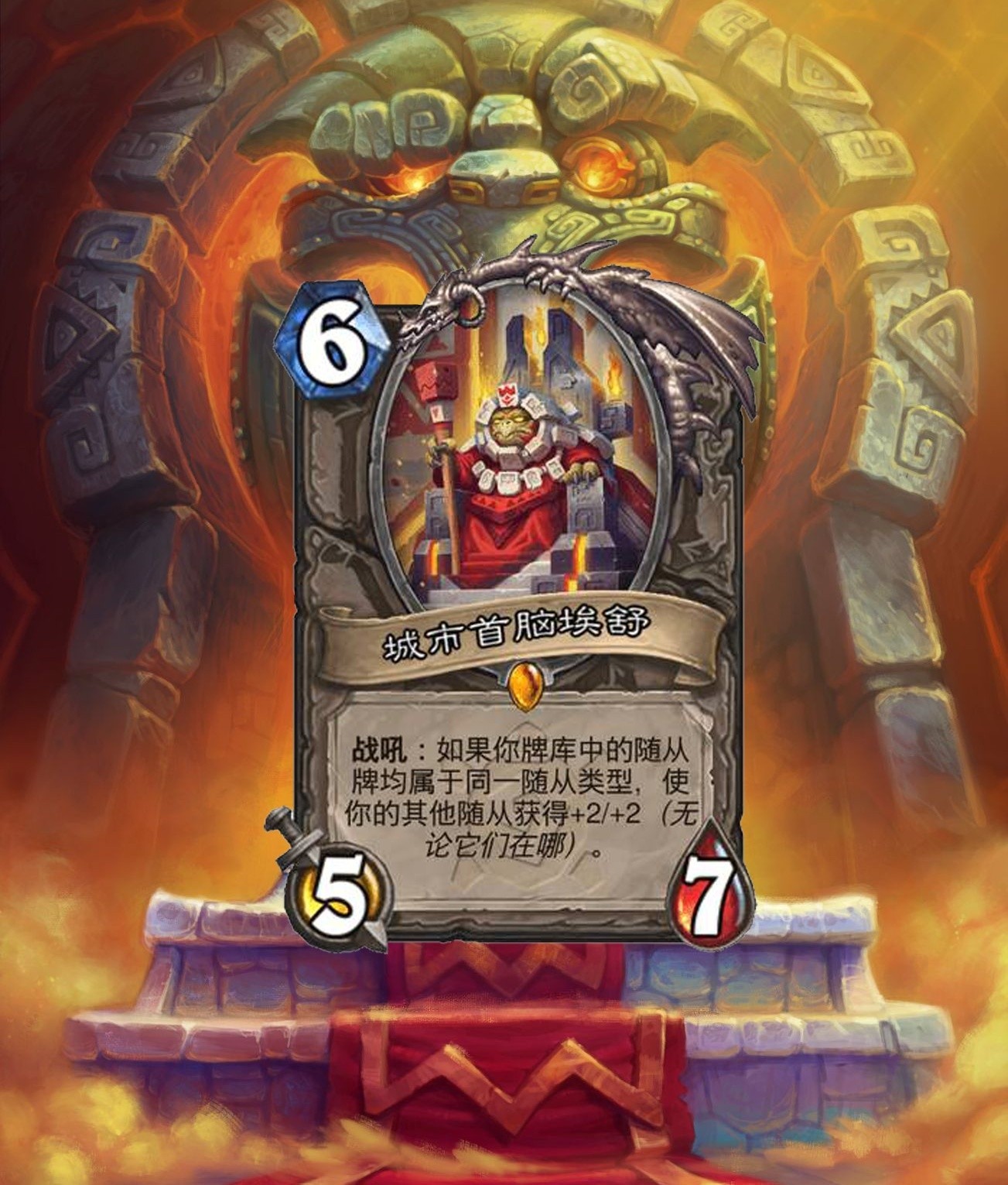 城市首脑埃舒: 接下来的中立橙卡是城市首脑埃舒,6费6/7,战吼效果是在牌库中每个随从都有相同类型时,使其他随从获得+2/+2,对于快攻卡组来说,6费似乎有点高,而且无法检索抽取,但其在特定构筑下的数值很高,如何有效使用是一个大问题。