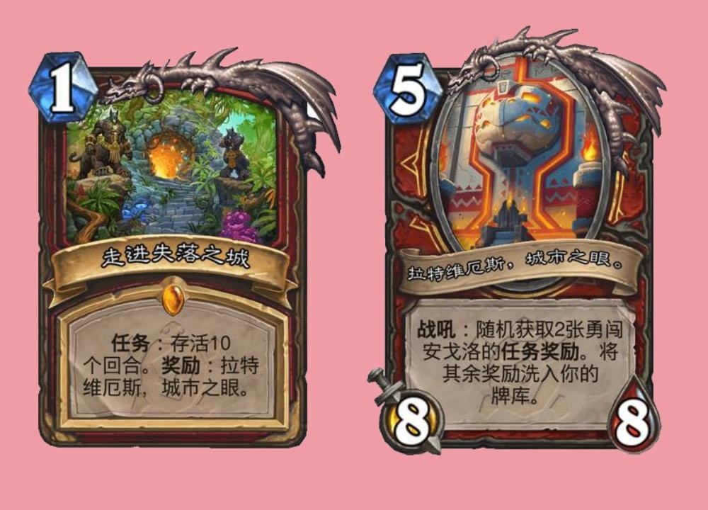 元素随从与任务奖励: 新版本还有元素和龙的双种族随从,以及战士的新任务走进失落之城等,都为玩家提供了丰富的选择和策略,任务奖励中的拉特维厄斯等城市之眼,更是增加了卡组厚度和取胜方式。