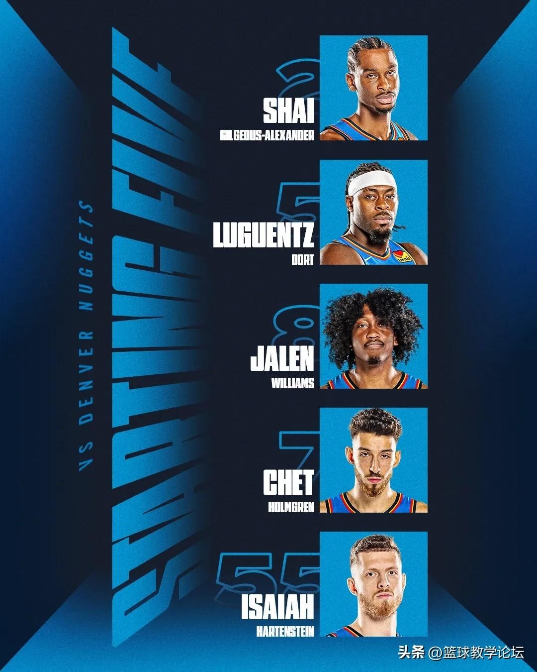 掘金队的首发阵容包括穆雷、布劳恩、小波特、阿隆-戈登和约基奇,而雷霆队则派出了亚历山大、多尔特、杰伦-威廉姆斯、霍姆格伦和哈尔滕施泰因,比赛开始前,由于雷霆在之前的比赛中休息了近十天,体力上占有明显优势,而掘金队在淘汰快船后,仅休息不到两天,体能状况较为紧张,掘金队的轮换阵容较为精简,只有八人的轮换阵容,替补球员的表现将成为一个重要的看点。