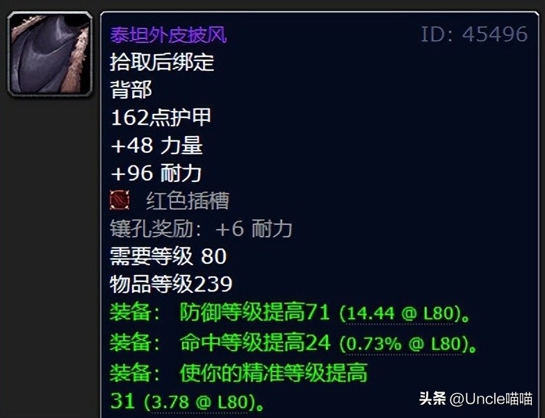 这款泰坦外皮披风是防战玩家的最佳披风选择,其命中精准双加持和防御等级的提高,让玩家在抗击打能力上实力倍增,它还带有红色插槽,为玩家提供更多的装备搭配可能性,这款披风将为防战玩家带来前所未有的战斗体验,让你在战场上更加从容面对敌人。