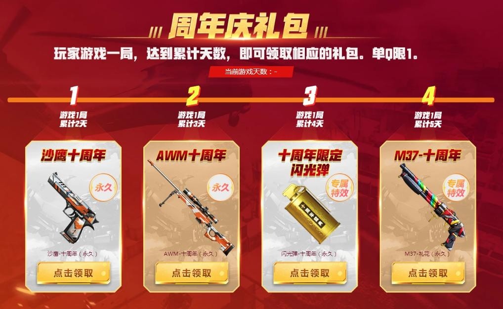 除此之外,还有十周年限定永久皮肤免费领取!是不是已经心动了呢?赶快进入官方活动界面,领取你的专属好礼吧!让我们共同见证并庆祝CF的十周年庆典!别忘了关注官方活动页面,更多惊喜等你发现!