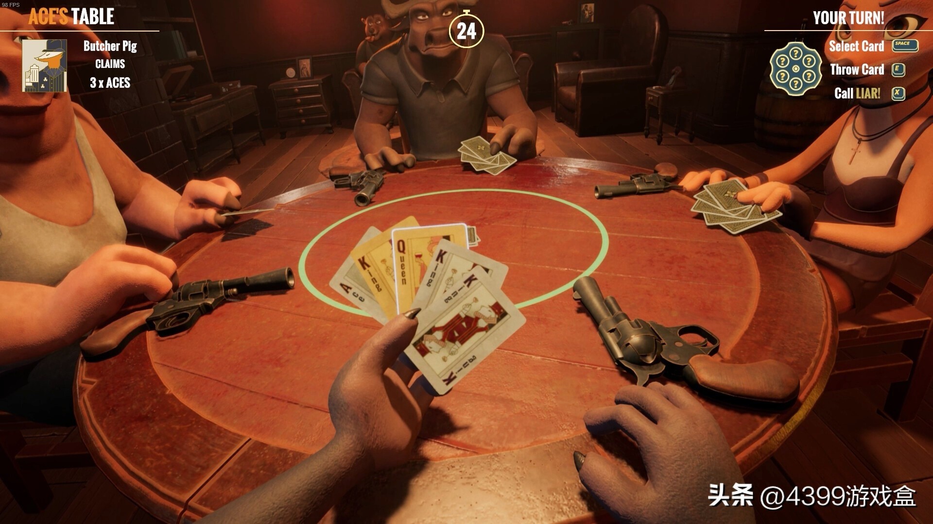 在打牌模式中,桌上有6A+6Q+6K+2J一共20张牌,其中2J大小王牌可作为任何牌使用,每场对局会随机指定一张为真牌,玩家需要据此出牌并报出数量,下一位玩家选择质疑上家或不质疑继续加牌,若质疑正确则上家进行俄罗斯轮盘开枪,若质疑错误则自开一枪。