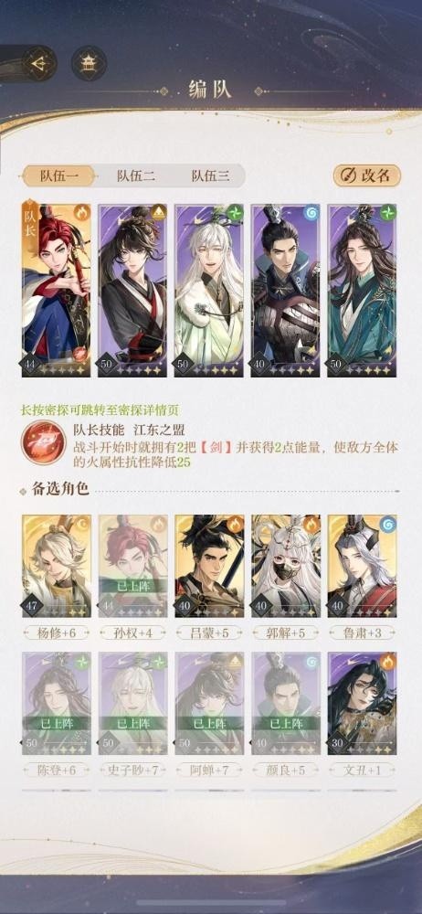 - 火队:全队火属性伤害升级,充分利用孙权的火属性技能优势,与郭解、吕蒙、陆逊等组成火队,造成大量伤害。