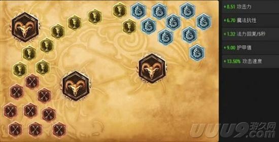 在符文配置方面,红色符文选择全放攻击力符文,这使得艾希的W技能前期耗血能力更加可怕,除了W技能,艾希的Q技能随着等级提升,攻击性收益系数也会增加,因此放置攻击力符文十分必要,黄色符文则选择固定护甲,大精华选择攻速符文,在蓝色符文方面,选择了5个固定魔抗后,剩余符文选择了法力回复符文,这种配置让艾希拥有更多的蓝量,更有效地使用W技能消耗敌方血量。