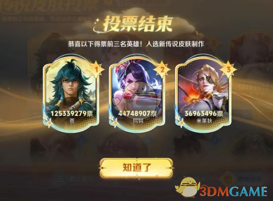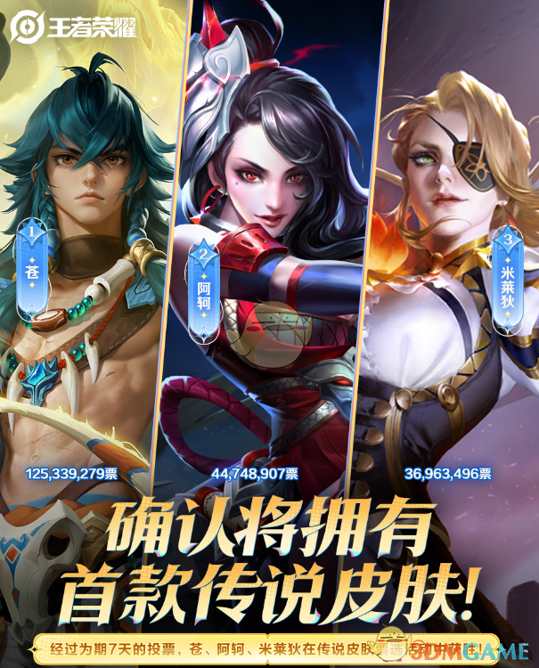 经过激烈的角逐,苍以绝对优势胜出,共获得125339279票,阿轲和米莱狄分别以44748907票和36963496票获得较高支持,这三款传说品质的新皮肤预计将在未来的两年内陆续上线,具体上线时间还请关注官方公告。