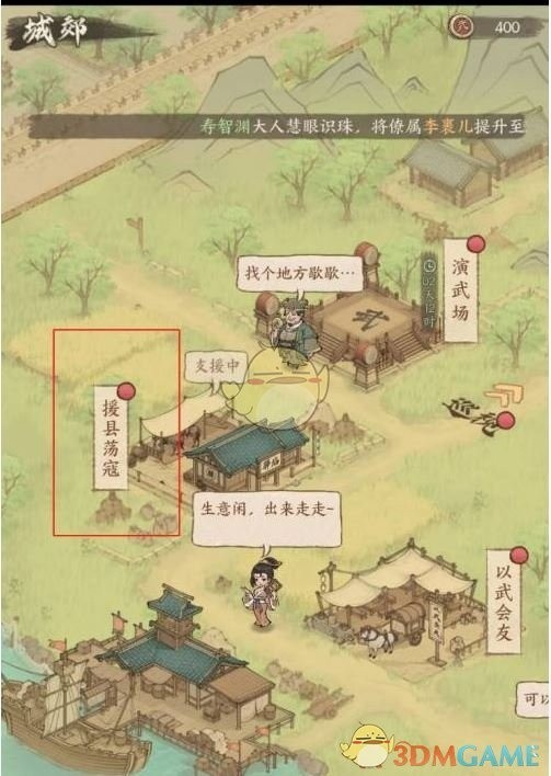 你需要进入游戏内的良田城郊界面,你会看到一个醒目的选项:“支援县城,击退匪寇”,点击这个选项,你就可以正式开启援县荡寇的任务了。